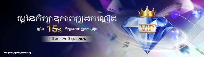 - ទទួលបានប្រាក់រង្វាន់បញ្ចូលទឹកប្រាក់ឡើងវិញ 15% ដោយធ្វើការដាក់ប្រាក់អប្បបរមាចំនួន 300,000៛/USD 80 ទៅក្នុងគណនី SBO របស់អ្នកក្នុងអំឡុងពេលប្រូម៉ូសិន។