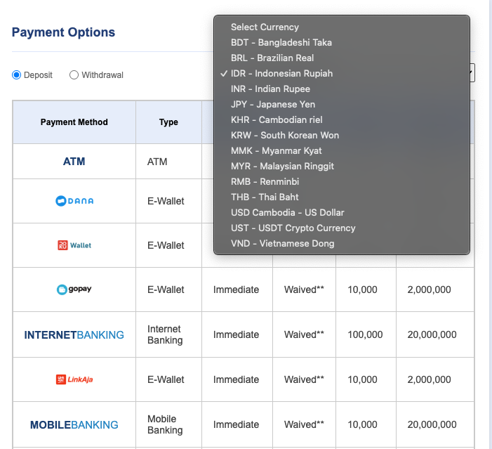 The payment methods available depends on the currency you are using when registering for your SBOTOP account and your country of residence.